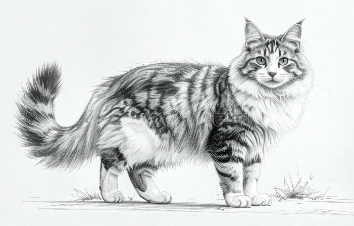 Mantello: il suo mantello è unico: lucido, pesante e idrorepellente, protegge il gatto da neve e umidità. È più lungo su gorgiera (formando una sorta di "jabot" o collare, più pronunciato nei maschi), stomaco e zampe posteriori (i caratteristici "pantaloni"), mentre è più corto su dorso e collo per evitare grovigli nel sottobosco .